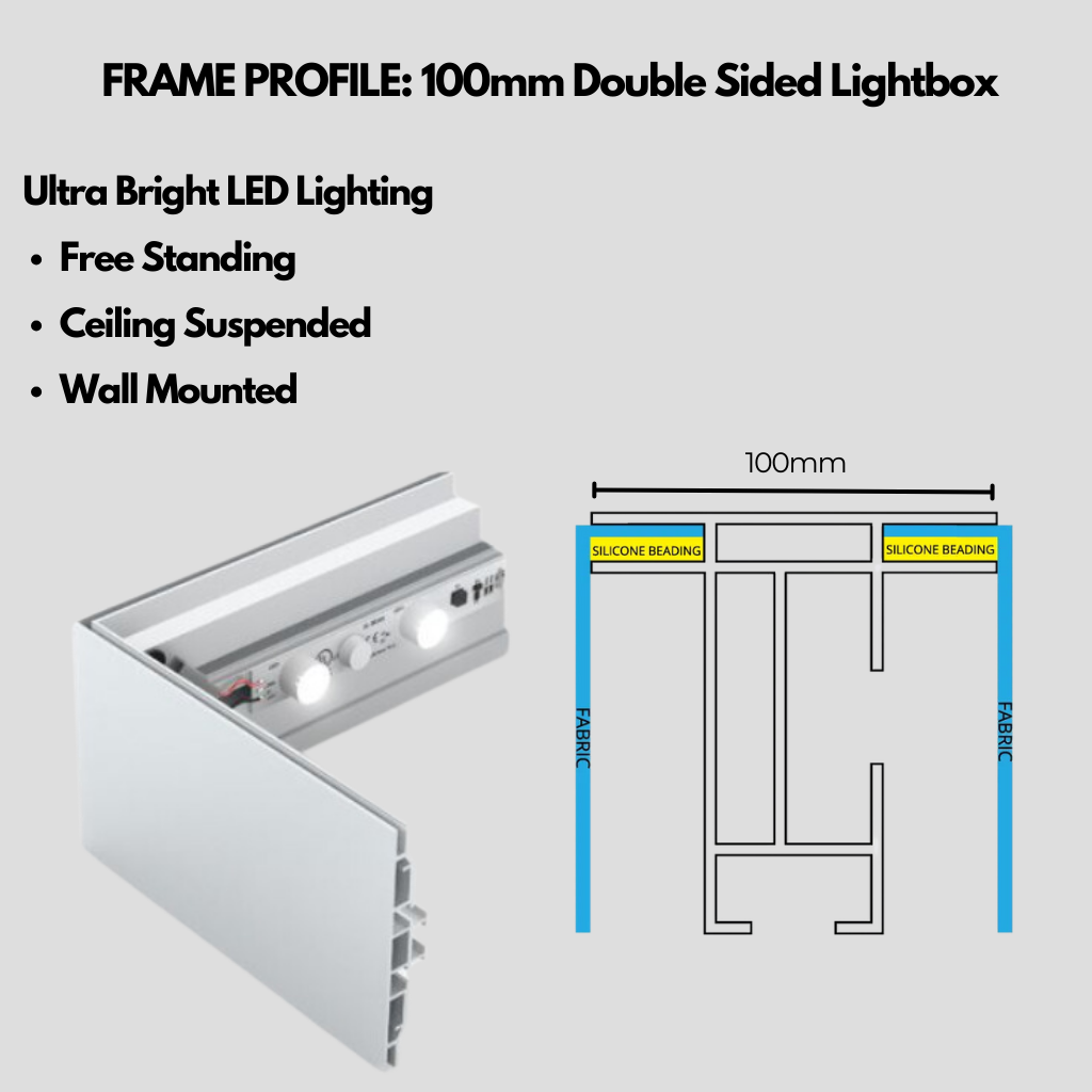 Our free-standing Backlit SEG Lightbox Displays consist of an heavy duty aluminium extrusion frame kit, and a SEG tension fabric graphic. The frame is 100mm thick and comes with stabilising feet.