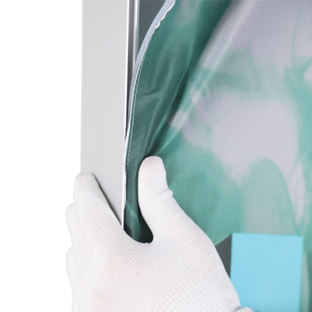 The fabric graphic is printed using a dye-sublimation process onto 260gsm Backlit Polyester. This process gives the image great vibrancy and is finished with a silicone edging (kedar). The graphic is then slotted into the aluminium channel and tensioned around the edge.