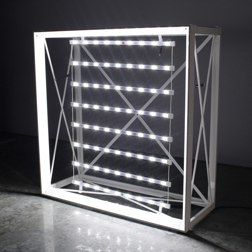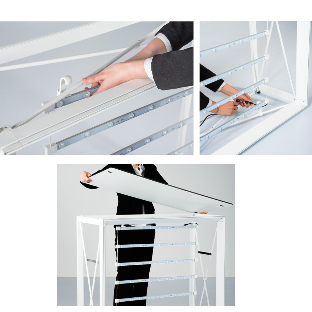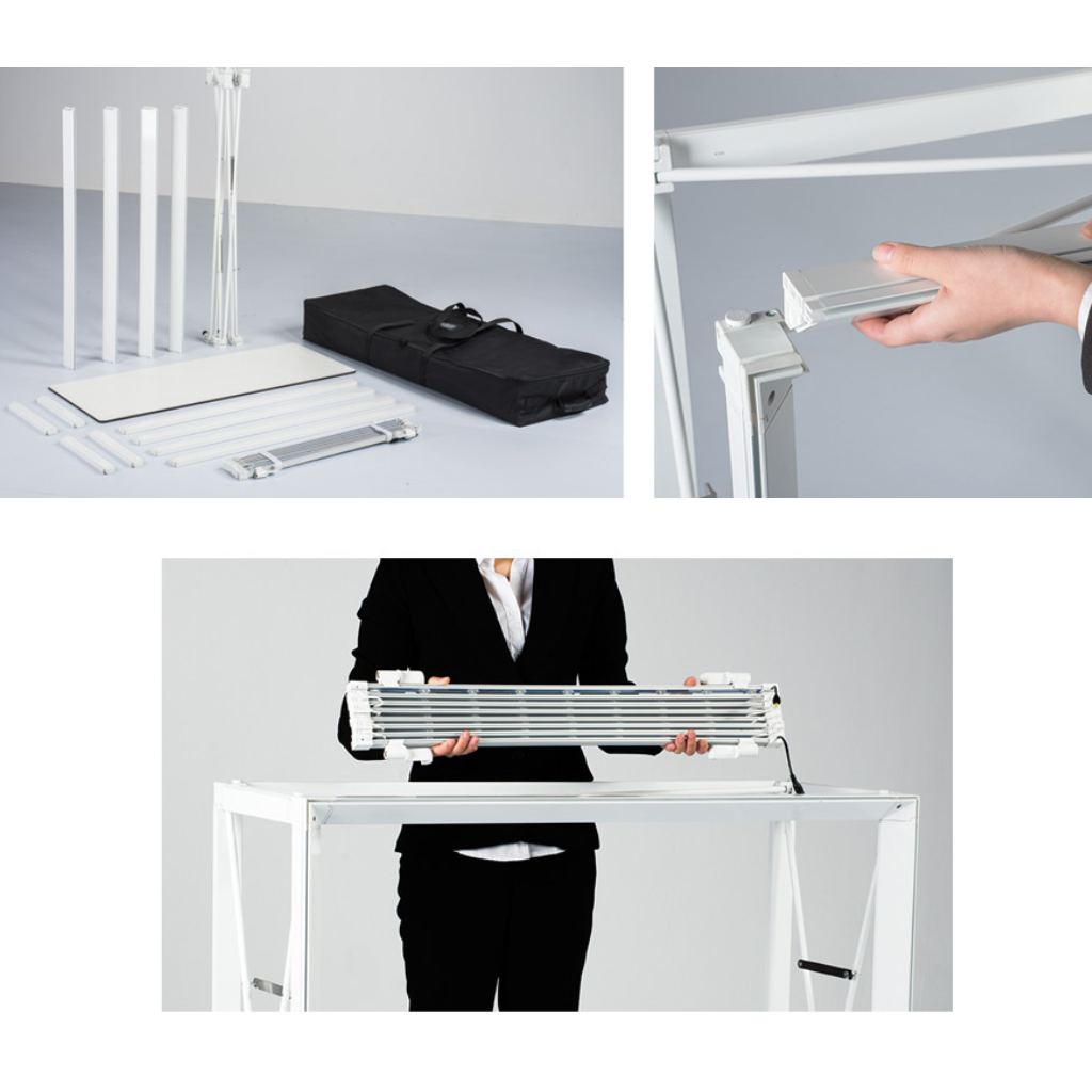 This SEG Lightbox Pop UP Exhibition Counter helps to give you the edge when vying for others' attention. The curtain of LED lights quickly and easily hook onto the pop-up style frame in seconds. No tiny screws. No cumbersome connectors. No hassle. When you're finished with your show, everything packs in a soft wheeled carry bag.
