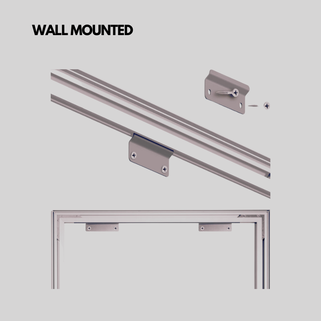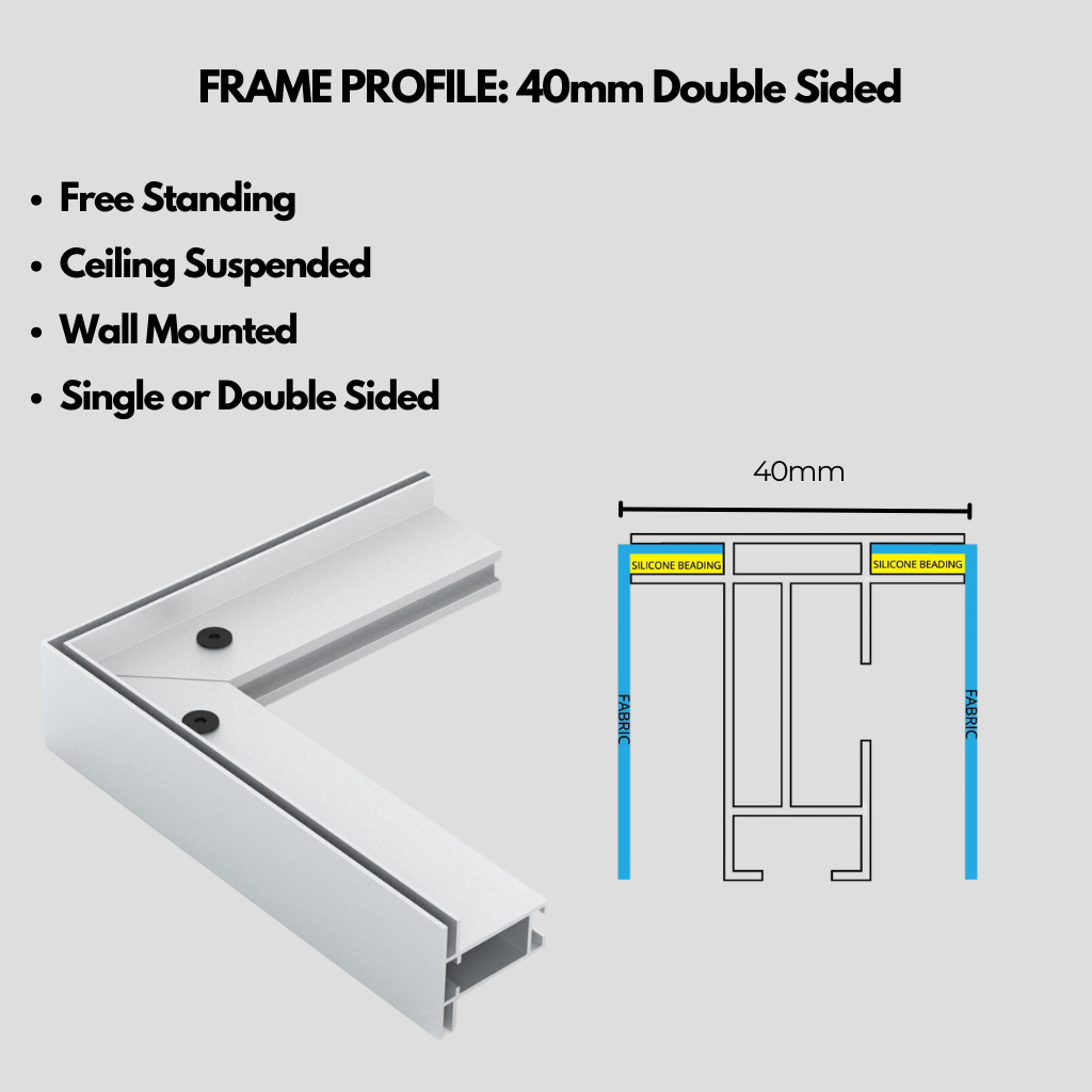 Frames use a 100mm (Backlit), 40mm, 25mm or 15mm (Non-lit) super lightweight single-sided profile for internal use with a 2mm aluminium all-depth fitting. Frames come in sections and require some assembly with an allen key (included).