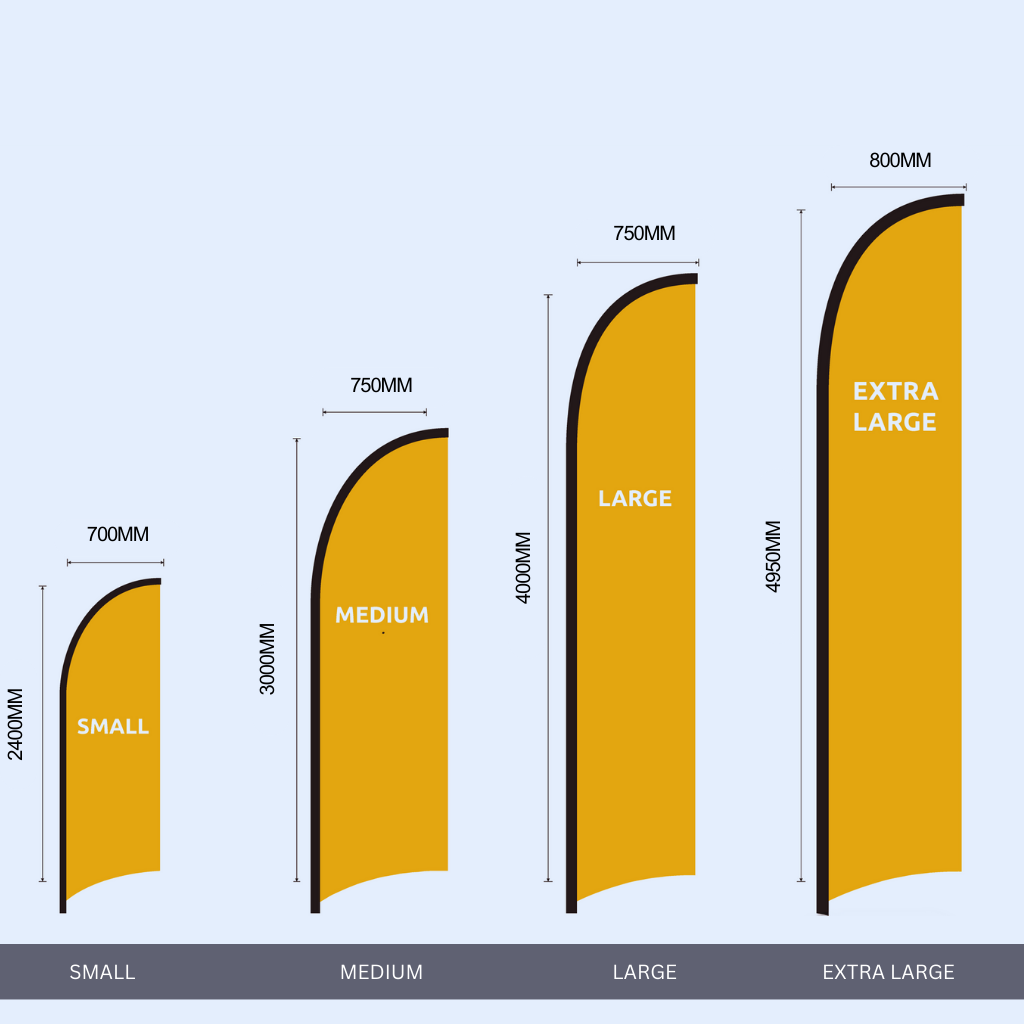 Single sided Feather Banner Flags use a 120gsm polyester material. Double sided Feather Banner Flags are printed onto 145gsm Blockout polyester material and 2 of these banner flags are sewn back to back.