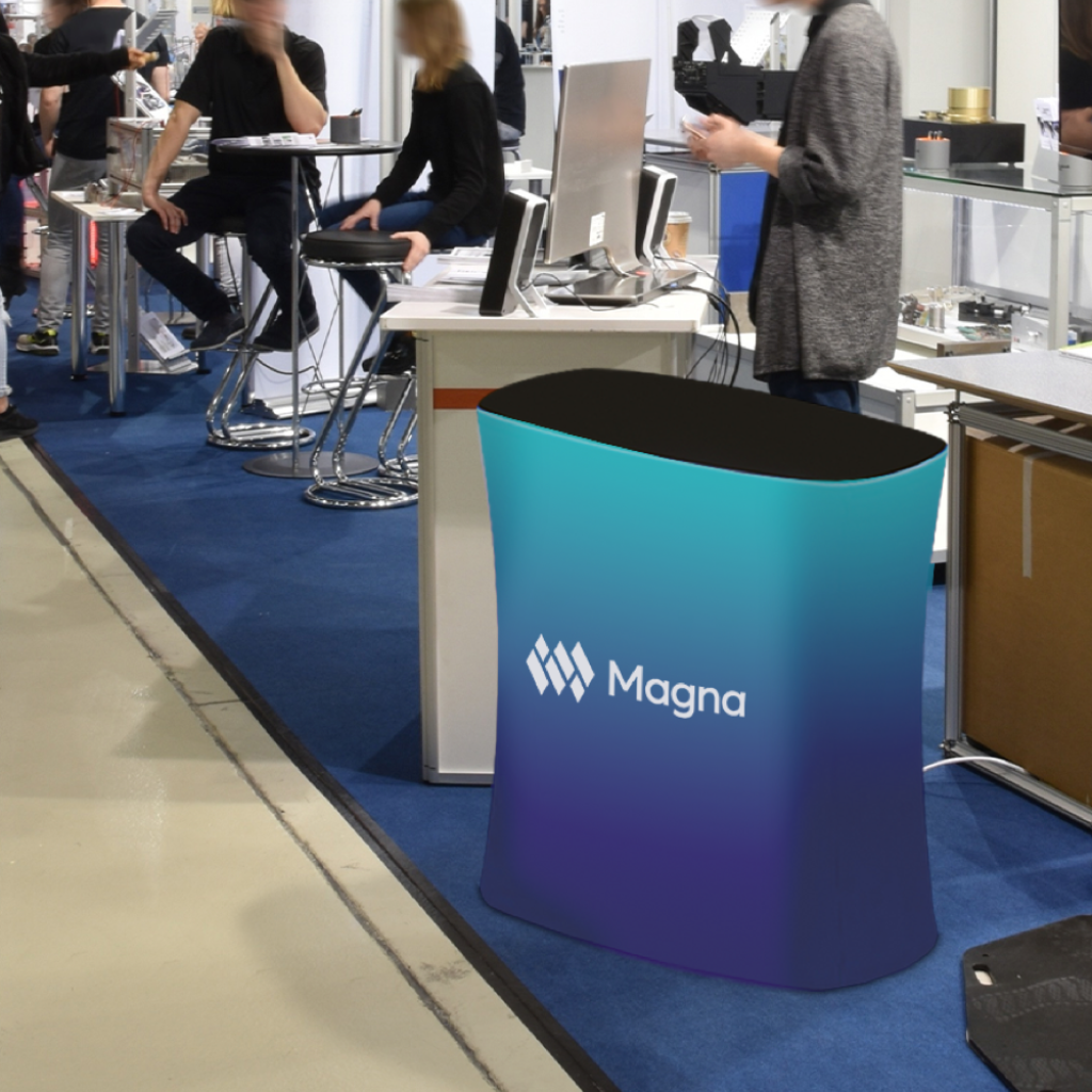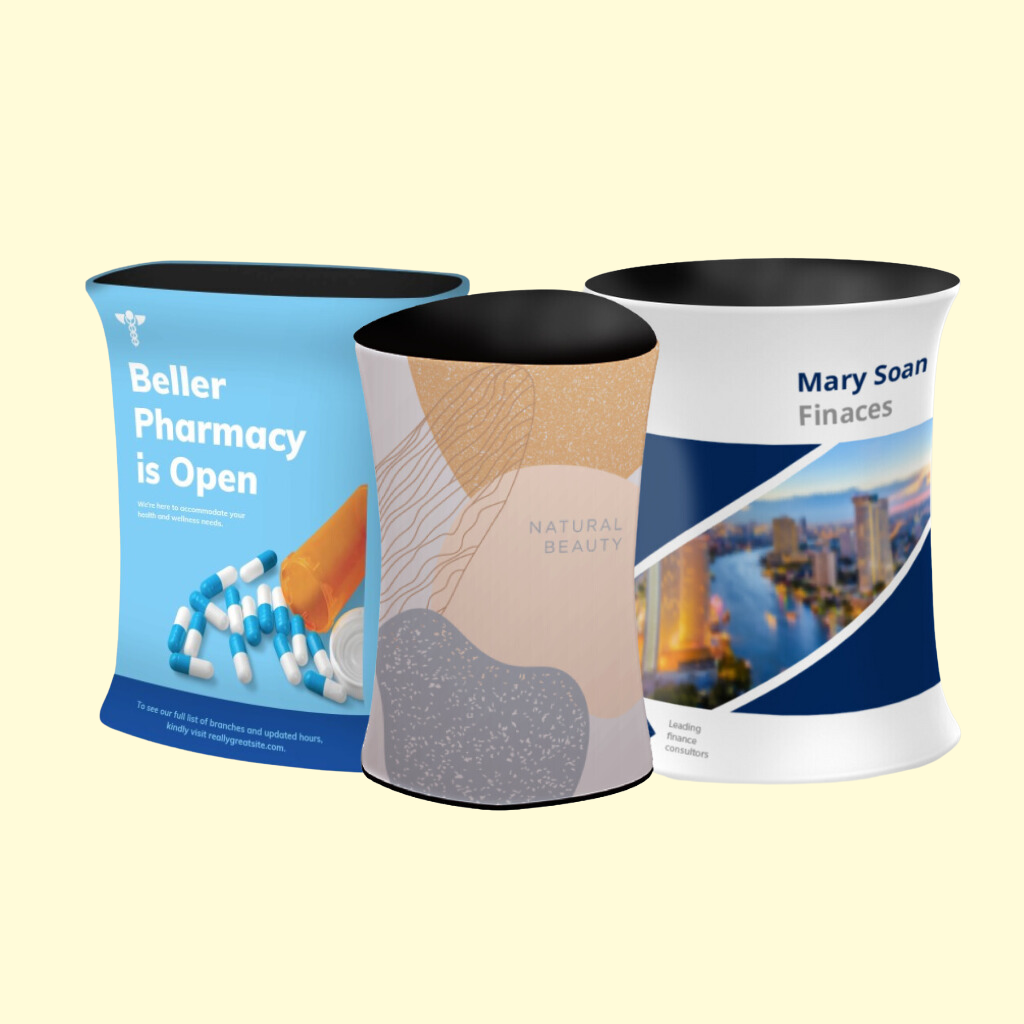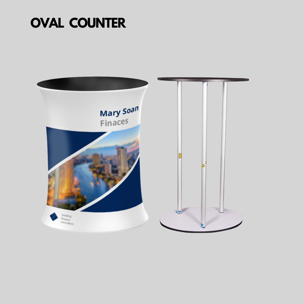 Stretch Fabric Display Counters consist of a counter-top, base and lightweight tubular aluminium poles. A printed fabric cover is included.